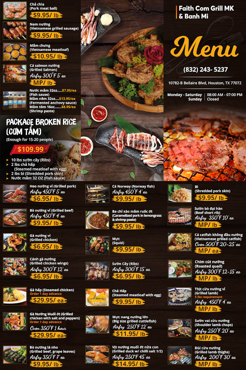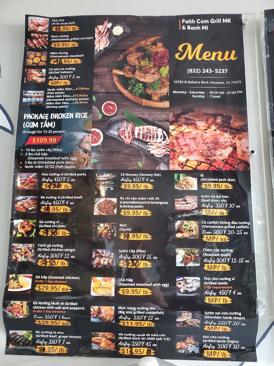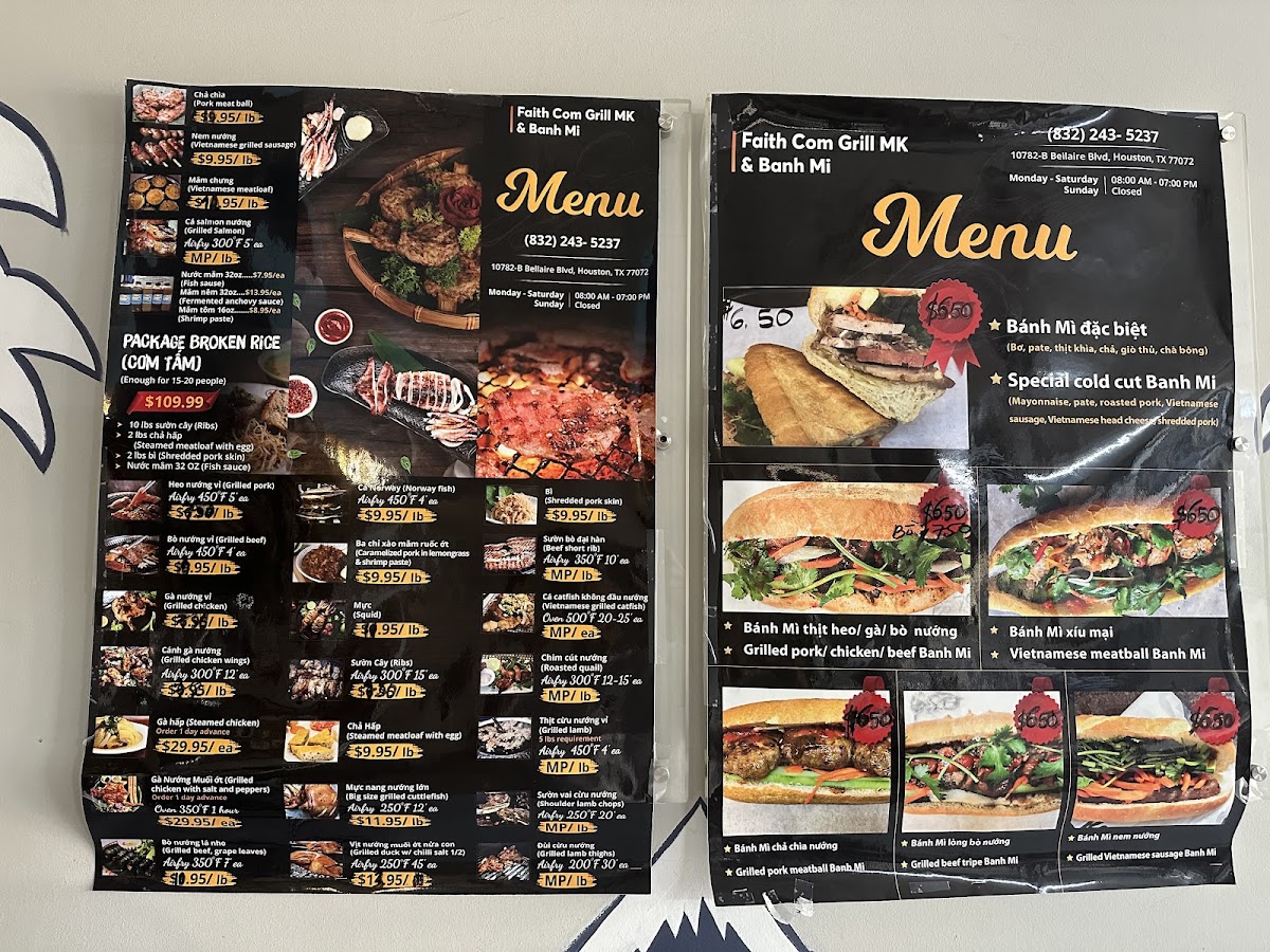 Located at 10782-B Bellaire Blvd in Houston, TX, Faith Com Grill MK offers a delicious taste of Vietnamese cuisine at budget-friendly prices. This family-run gem boasts a concise yet enticing menu, showcasing their specialty: Bánh Mì. Each sandwich, priced at just $5.50, features mouth-watering combinations such as the Đặc Biệt and Xíu Mại, packed with flavor and freshness.